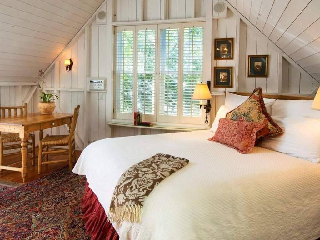 The upper level Hayloft blends the old with the new. French doors open onto a private deck overlooking our gardens. This room features a king bed, leather loveseat by the wood burning fireplace, and antique furnishings. The spacious bathroom features a tiled, glass enclosed shower. To book your reservation, please use the calendar at the top of the page.