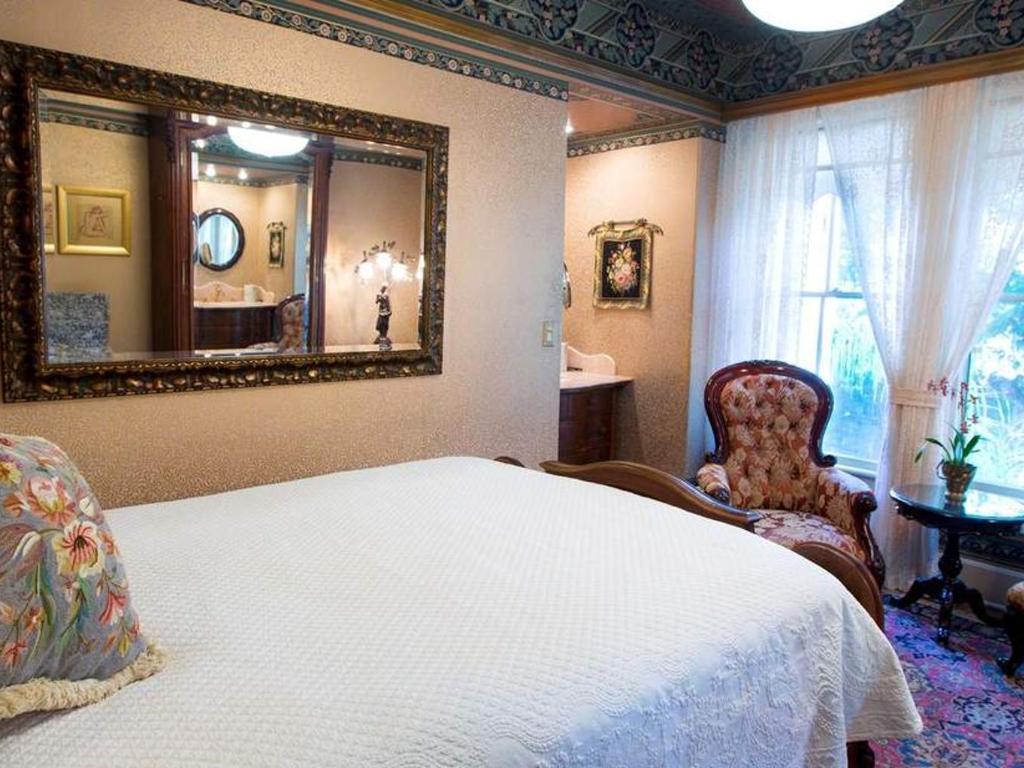 This charming, cozy room features authentic Victorian wallpaper in rose tones that reflect the whimsical Aesthetic Movement of the time. It has an antique queen bed and a detached bath which is fully private. The room has a marble topped vanity sink and the private bath is one step across the hallway with shower, sink & toilet. Luxurious bathrobes and slippers are provided. To book your reservation, please use the calendar at the top of the page.