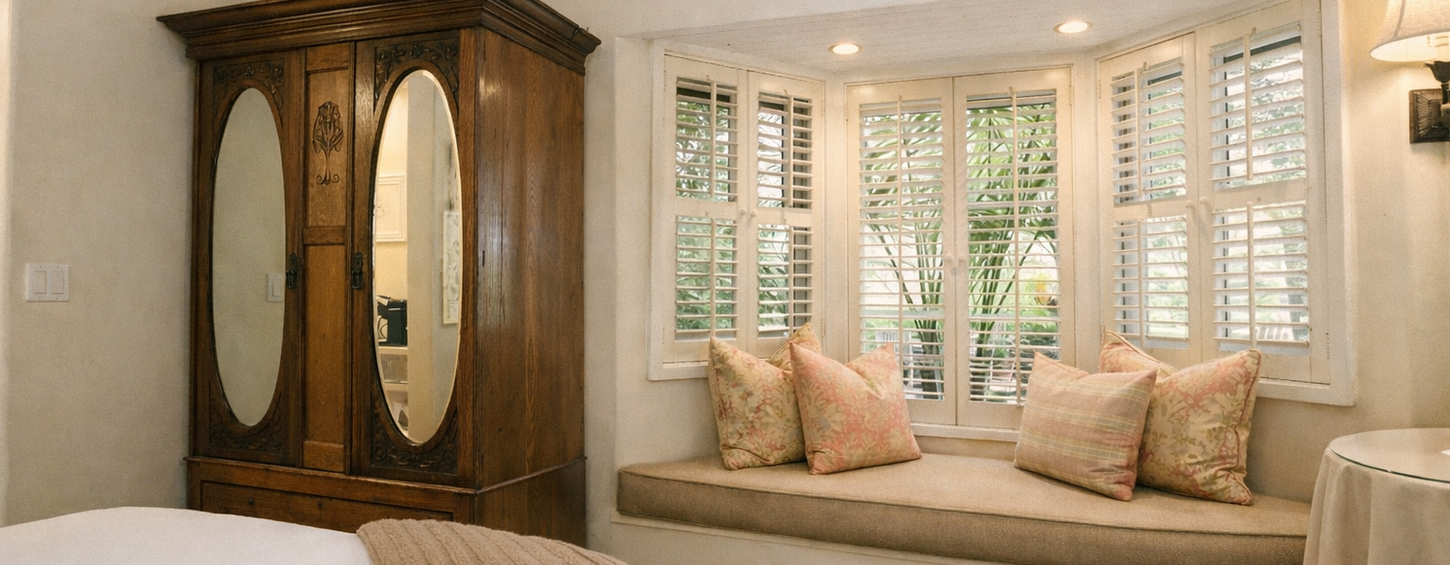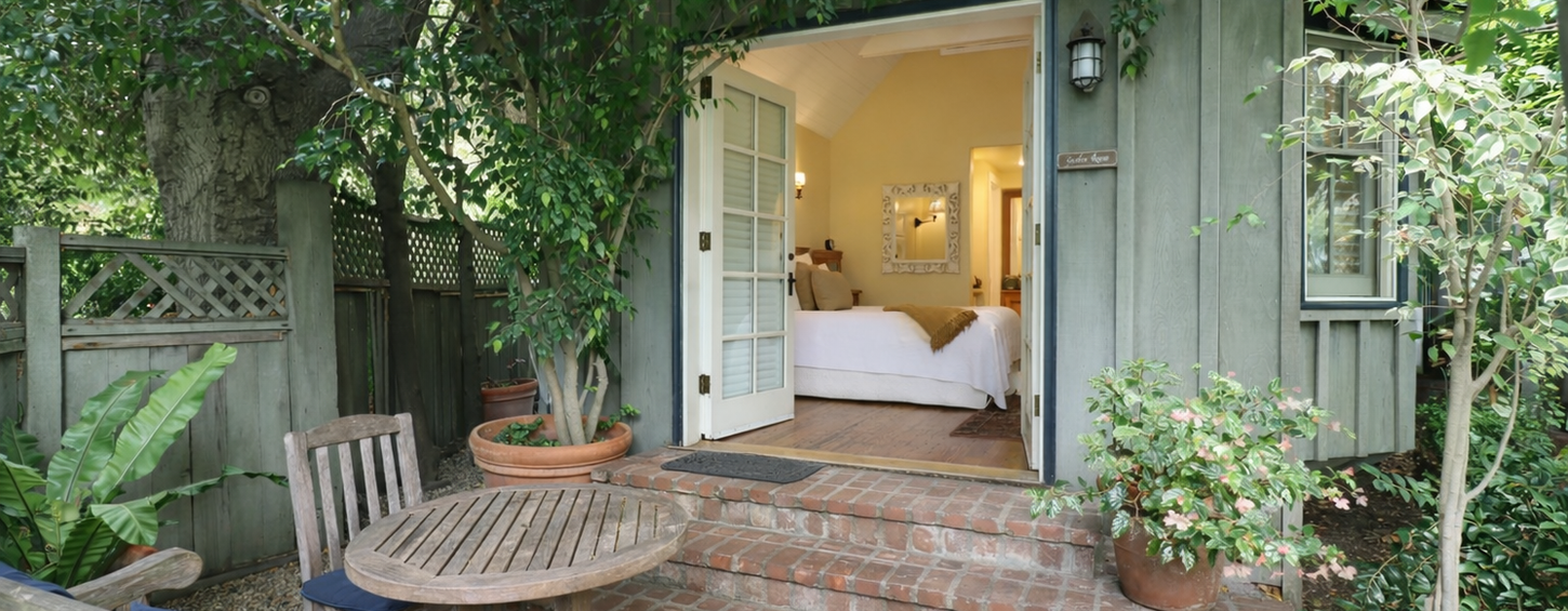 French doors open from your private patio into a bright, welcoming space filled with natural light. Inside, antique pine floors, a vaulted ceiling with skylight, and a charming bay window create an airy, cottage-like atmosphere. A queen bed and a thoughtfully appointed bath with shower complete the space.