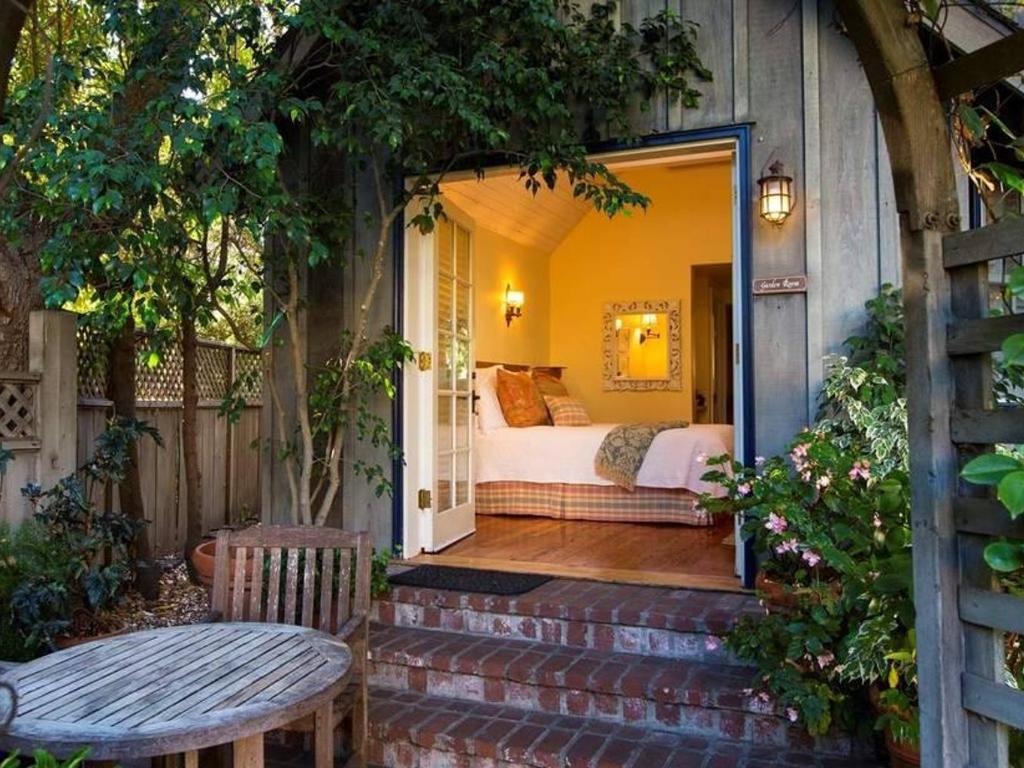 Nestled under the oak trees with a lovely view of our lawns and gardens. Large French doors open into the room from the private patio. This bright room has antique pine floors, a vaulted ceiling with a skylight and a bay window. Queen bed and bath with shower. To book your reservation, please use the calendar at the top of the page.